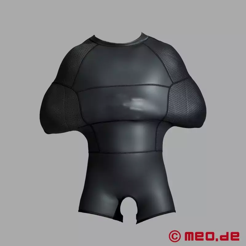 Olemme varustaneet pakkopaitamme olennaisilla aukoilla: Sukupuolielimille ja takapuolelle! Vielä intensiivisemmän sidontatunteen saamiseksi olemme varustaneet pakkopaidamme sisähylsyllä, johon molemmat käsivarret voidaan työntää. Osittainen rei'itys parantaa myös pakkopaidan hengittävyyttä.