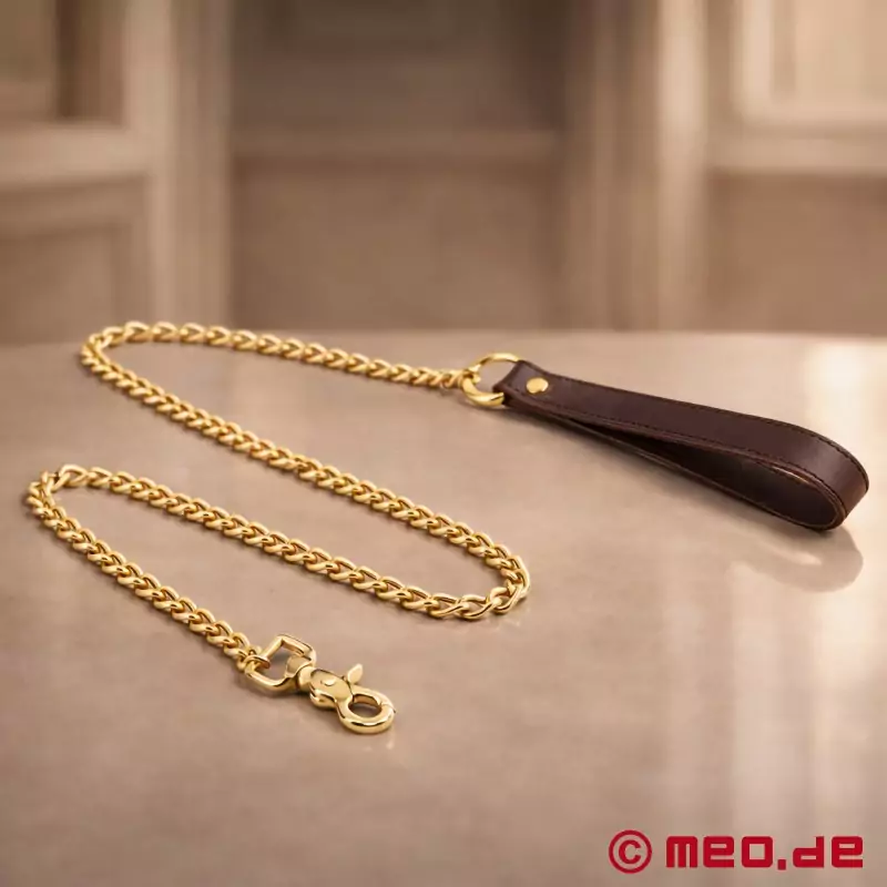 Nahkainen orjahihna on varustettu mukavalla käsihihnalla, joka istuu täydellisesti käteen ja tarjoaa turvallisen ohjauksen. Käsilenkki on yhdistetty kullanväriseen ketjuun, joka on sekä esteettisesti miellyttävä että toimiva pituutensa ja vakaan liikkuvuutensa ansiosta. Tämän laadukkaan orjahihnan avulla orja tuntee selvästi, kuka hallitsee ja vastaa suhteesta.