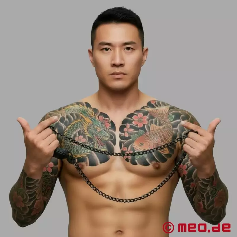 BDSM, joka koostuu pehmustetusta nahkasilmukasta, jossa on timanttiompelu, mustaksi pinnoitettu metalliketju ja karabiini, jolla se voidaan nopeasti kiinnittää bondage-pannan D-renkaaseen. Niitit on viimeistelty mustiksi ja niitissä on myös MEO®-brändi. Mukana on myös nahan hoito-ohjeet ja samettinen säilytyspussi.