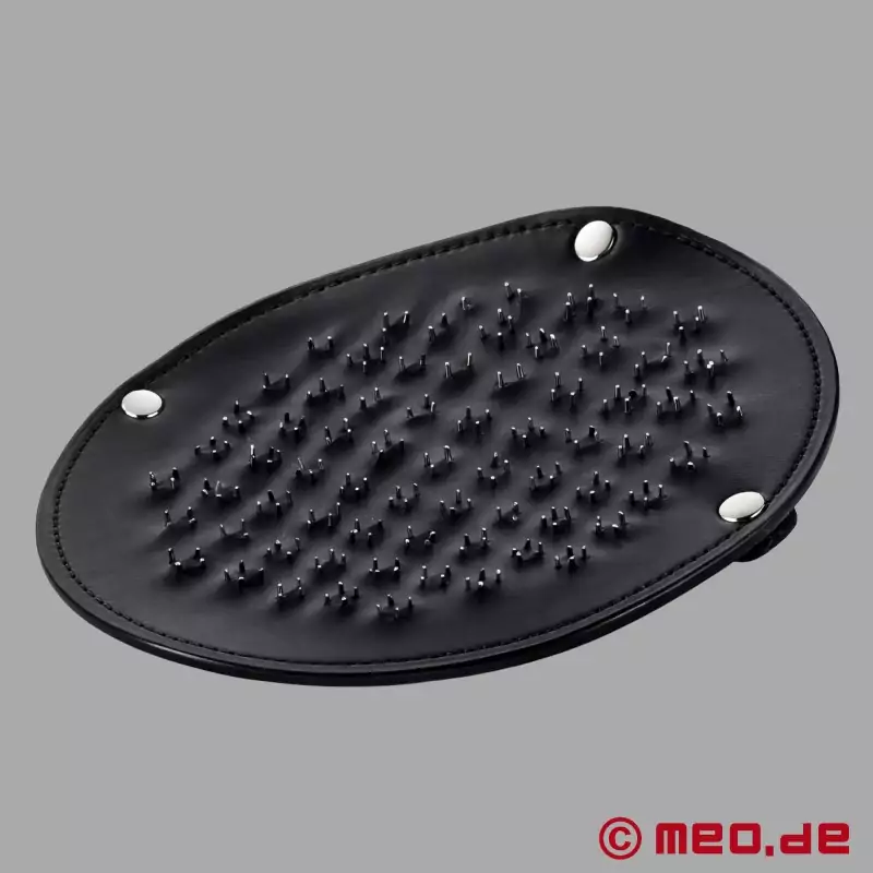 This stimulating, sharp, and sensual toy has hundreds of tiny pin pricks that are securely embedded into a high quality, thick leather pad. The pin pricks are long enough to get the attention desired, but short enough so they do not break the skin. Straps go across your hand and fingertips to ensure a tight fit that will allow you to beat on the bottom as hard as you like. Let your imagination be your inspiration; how about one on each butt cheek under a pair of tight jeans?