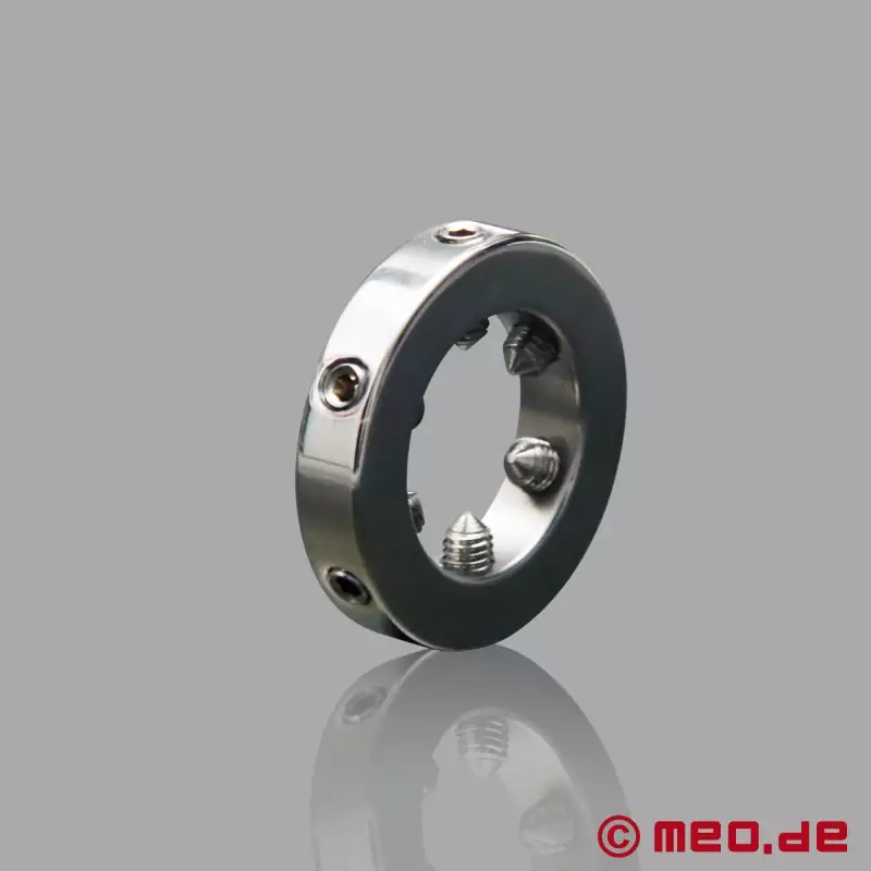 Dieser Eichelring ist ein sehr besonderer Eichelring für die etwas erfahreneren "Spieler". Gefertigt ist dieser Eichelring aus massivem Edelstahl. Er hat eine Wandstärke von 8 mm und 6 eingearbeitete Spikes. Diese -an der Spitze leicht abgerundeten- Spikes können mit dem beiliegenden Inbus-Schlüssel eingestellt werden wenn der Ring auf der Eichel sitzt.