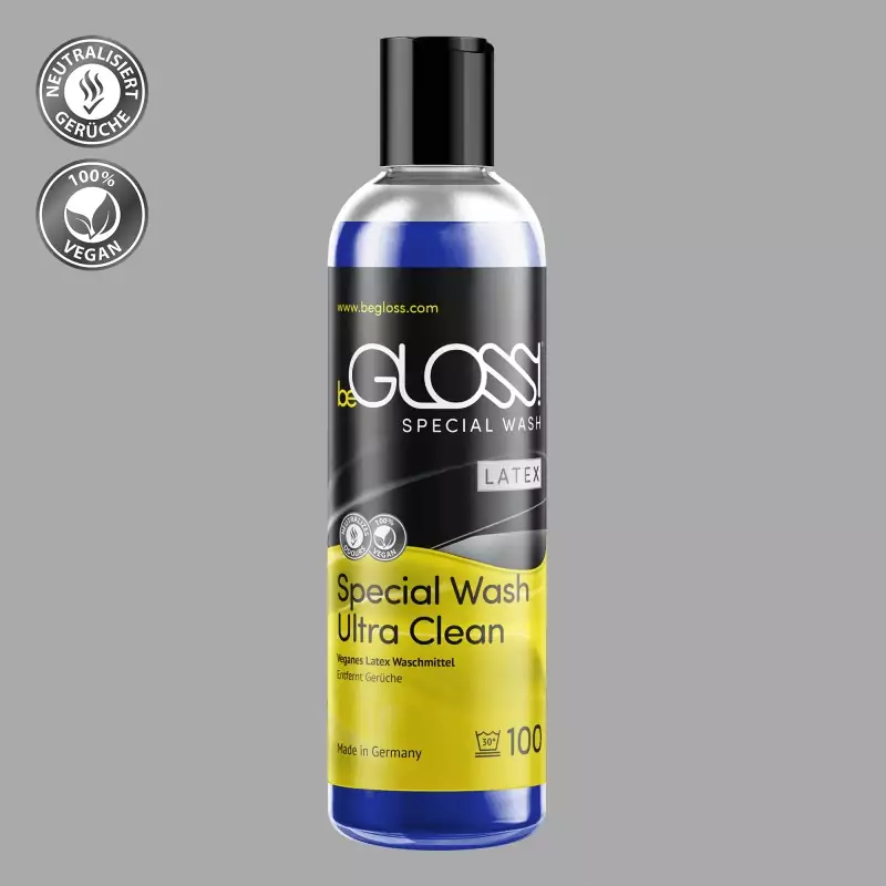 beGLOSS® Special Wash Latex™ on vegaaninen pesuaine, joka puhdistaa lateksivaatteet nopeasti, hellävaraisesti ja tehokkaasti - jopa alhaisissa lämpötiloissa. Se poistaa öljy- ja rasvajäämät, neutraloi hajut ja valmistelee lateksituotteet optimaalisesti kiillotusta tai varastointia varten. Valmistettu Saksassa.