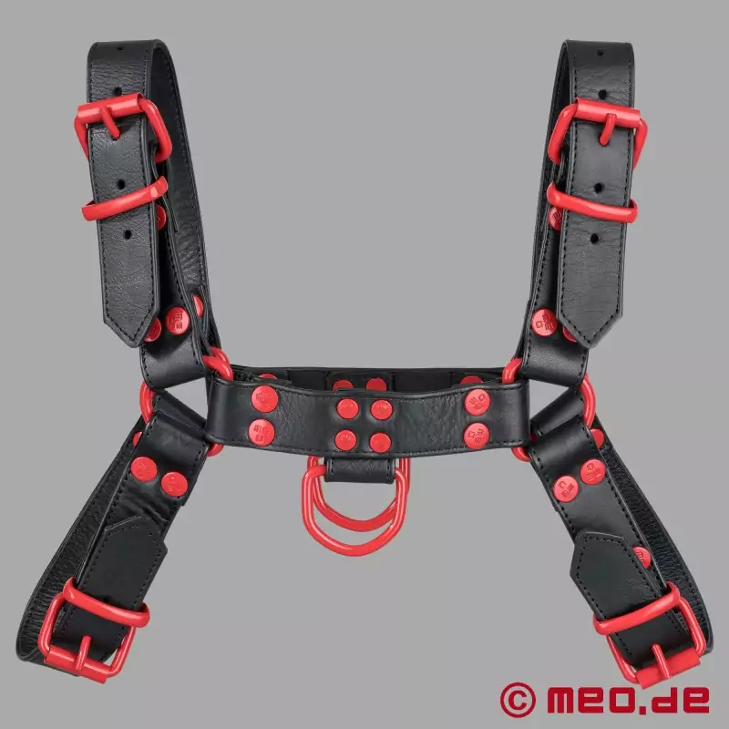 Tämä MEO®:n musta-punainen nahkavaljas on ykkösvalinta kaikille, jotka haluavat esitellä seksuaalisia mieltymyksiään näkyvästi ja itsevarmasti. FetishGear™-valjaat musta/punainen tekevät punaisilla yksityiskohdillaan selvän kannanoton - maskuliiniset, tinkimättömät ja vahvoihin suorituksiin tehdyt.