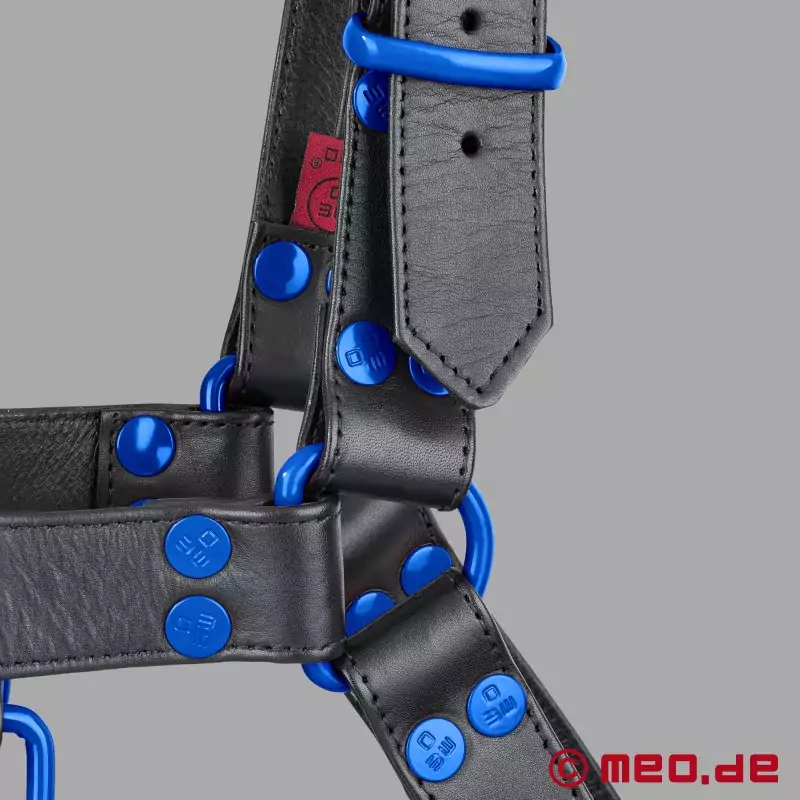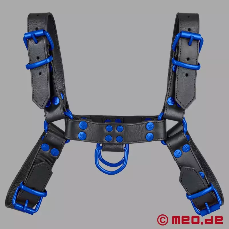 Tämä MEO®:n musta-sininen nahkavaljas on ensimmäinen valinta kaikille, jotka haluavat esitellä seksuaalisia mieltymyksiään näkyvästi ja itsevarmasti. FetishGear™-valjaat mustaa/sinistä tekevät selkeän kannanoton sinisillä yksityiskohdillaan - maskuliiniset, tinkimättömät ja vahvoihin suorituksiin tehdyt.