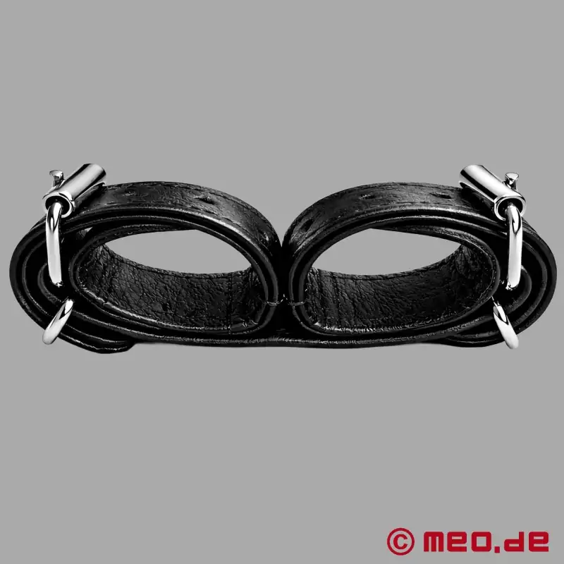 Mustassa nahkamallissa yhdistyvät selkeä ulkonäkö, miellyttävä tuntuma ja toiminnallinen vakaus. Säädettävien solkien ansiosta käsiraudat voidaan säätää sopiviksi, kun taas molempien elementtien kiinteä yhteys luo tälle bondage-varvasraudalle ominaisen vaikutuksen.