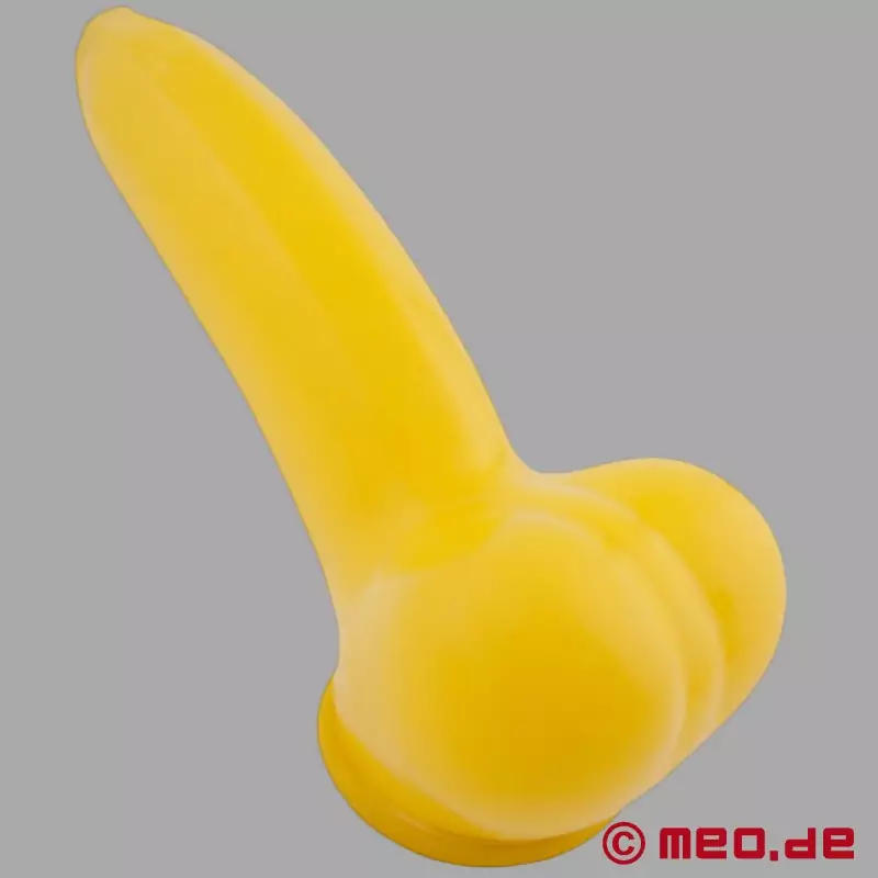 Anatomisesti muotoiltu, saumaton latexin valmistamana olevan penisholkin banaanimallisessa muotoilussa, jossa on muotoiltu kivespussi.