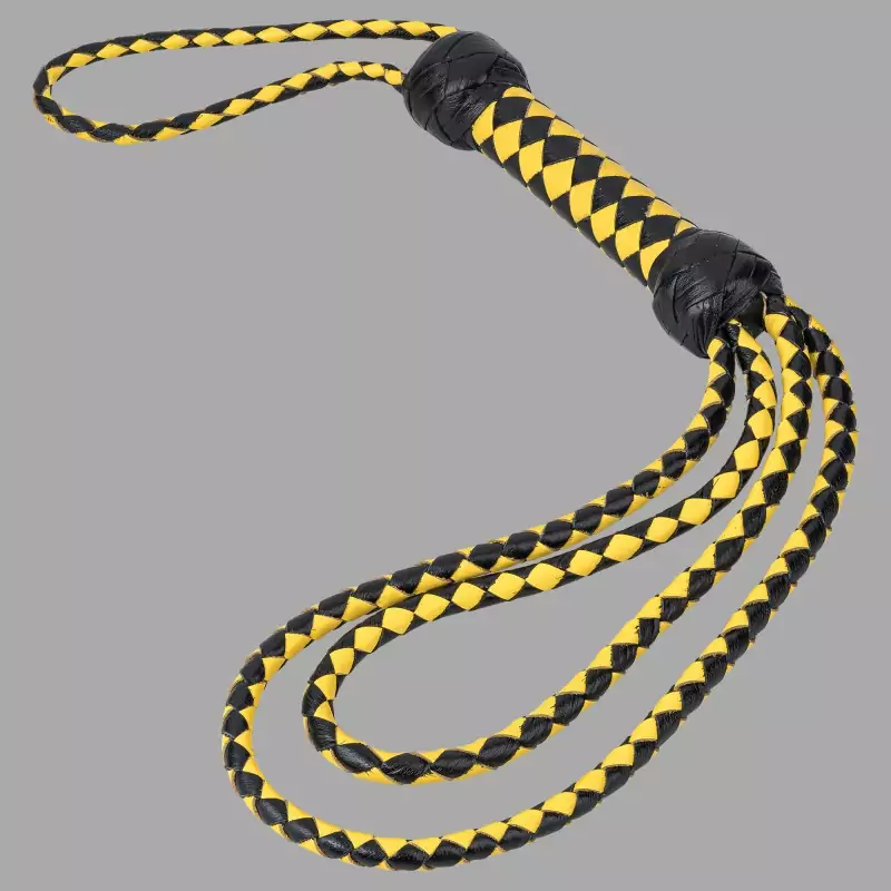 Silmiinpistävän mustan ja keltaisen värinen ruoska viestittää välittömästi, mikä kumppania odottaa: armoton kuri ja ehdoton alistuminen. Klassisten hihnojen sijaan tässä BDSM-ruoskassa on kaksi eripituista punottua nahkasilmukkaa, jotka iskevät täydellä tarkkuudella ja jättävät polttavan voimakkuuden syvällä kaikulla.