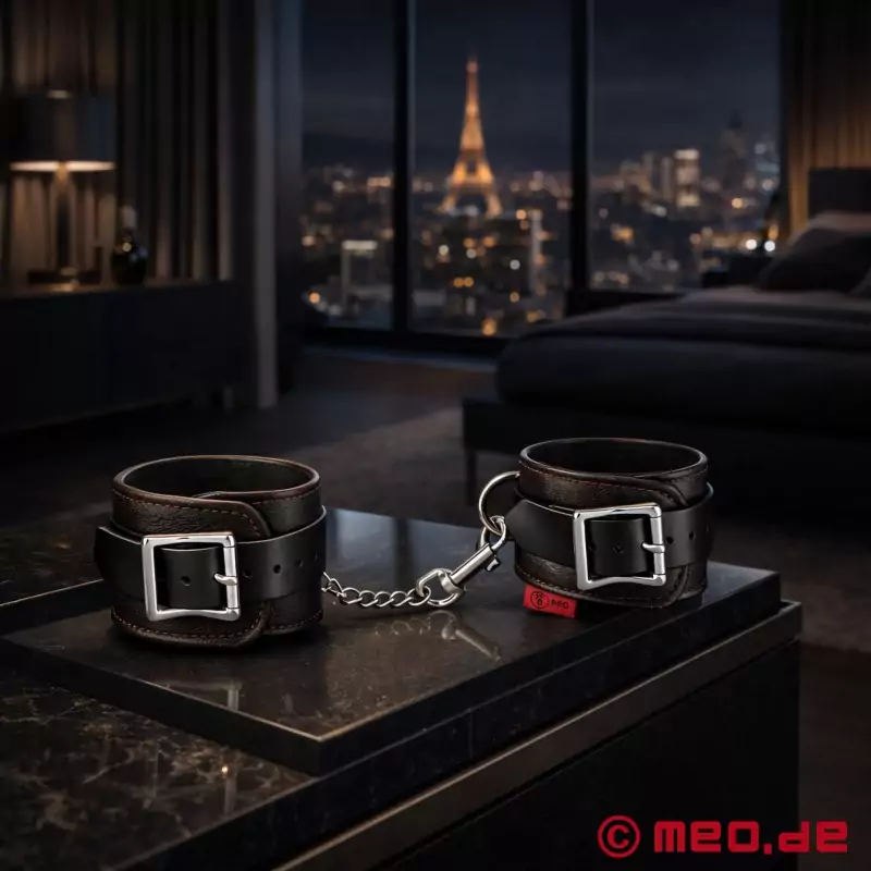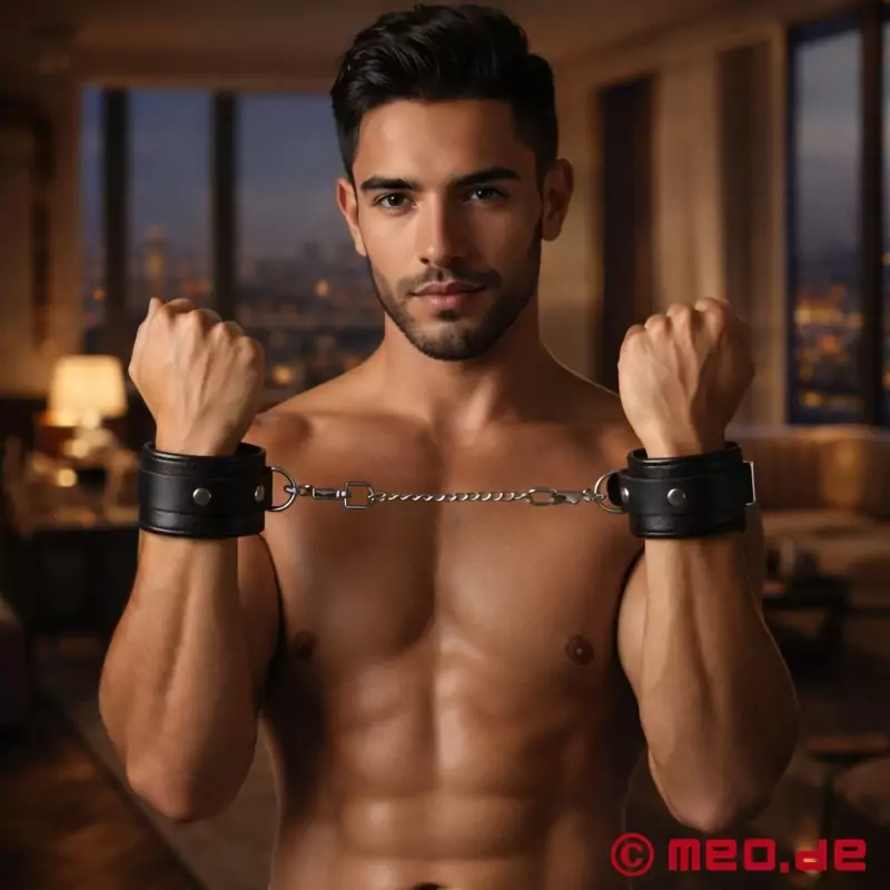 Säädettävien solkikiinnikkeiden ansiosta rannekkeet voidaan pukea nopeasti ja säätää oikean istuviksi. Tukeva ketju, jossa on nepparikoukut, pitää rannekkeet tukevasti ja turvallisesti yhdessä, mutta ne voidaan myös irrottaa kokonaan. Nahka, laadukkaat soljet ja niitit ovat tuhoutumattomia, joten rannekkeet eivät ole vain koristeellinen lisävaruste bondagea varten, vaan ne sopivat myös pidempiin BDSM-sessioihin. Erinomaisen valmistuksen ja pehmeän vuohennahan ansiosta rannekkeet voivat pysyä kiinni pidempäänkin ilman, että niistä tulee liian epämukavat kumppanille. Sidontavälineiden etupuolella on D-rengas liitäntäketjun kiinnittämistä varten.