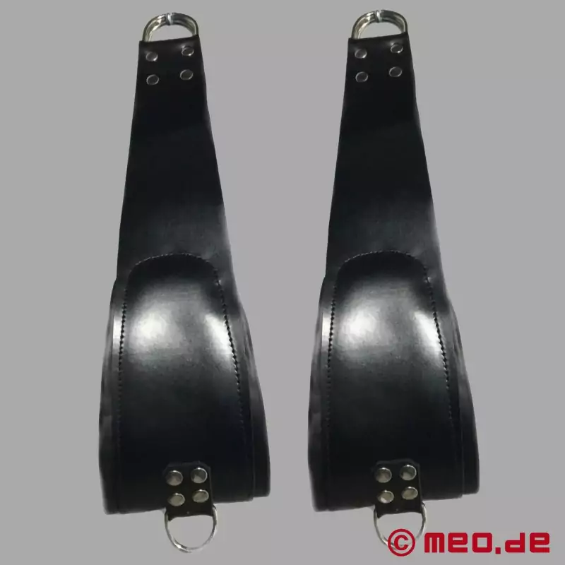 Soveltuvat erityisesti käytäntöihin, kuten nyrkkipanoon tai todella kovaan seksiin! Pehmustetut nahkaiset jalkahihnamme ovat slingin suosituin lisävaruste. Nämä jalkahihnat on valmistettu naudannahasta, ne on pehmustettu huolellisesti ja ne ovat erittäin kestävät. Ne sopivat täydellisesti nahkasilmukoillemme, sling-matoillemme ja sling-laudoillemme. Jalkahihnat on niitattu 4 kertaa D-rengasta kohden ja ne kestävät suuria kuormia. Integroidut D-renkaat mahdollistavat jalkasilmukoiden kiinnittämisen slingin kiinnitysketjuihin mukana toimitettujen karabiinien avulla.