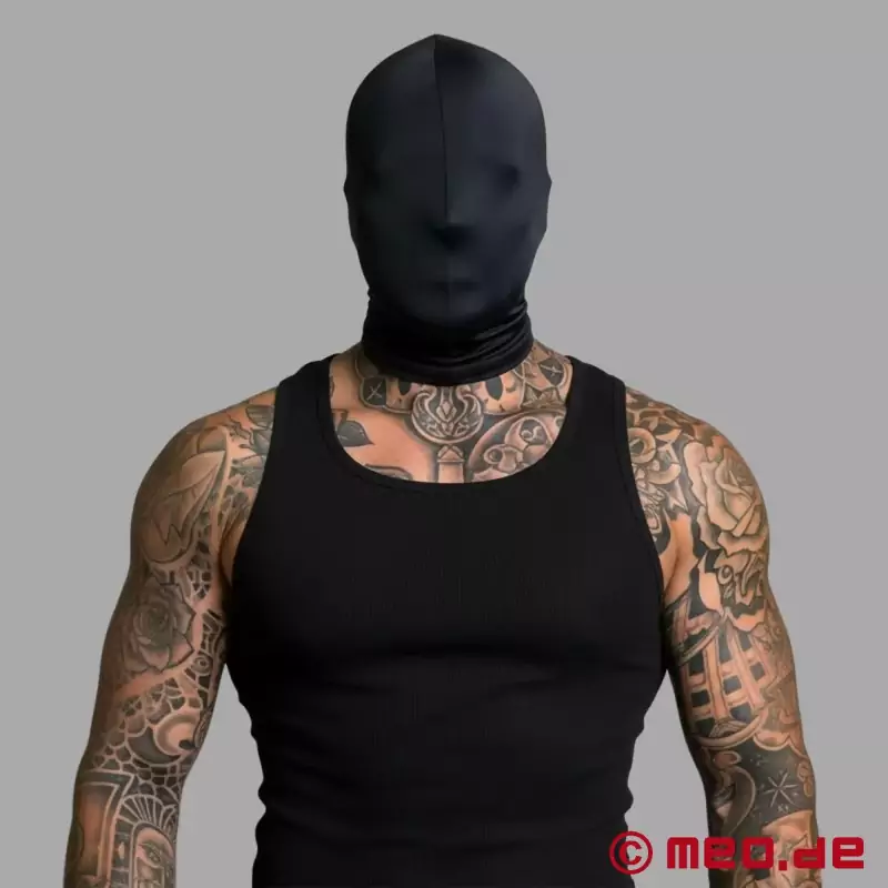 Käyttämällä tätä ensiluokkaista spandexia ilman aukkoja sisältävää naamiota kosketus havaitaan paljon voimakkaammin, koska näköaistin puuttuminen herkistää muut aistit. Täydellinen naamari aistien riistoon BDSM-session aikana.