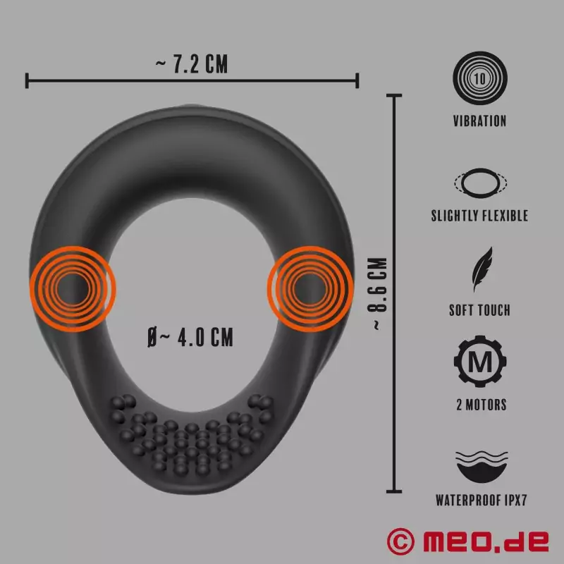 Kymmentä värähtelymoodia ohjataan suoraan renkaassa napin painalluksella. Värähtelevä Cock Ring on vedenpitävä ja sitä voi käyttää myös kylpyammeessa, suihkussa tai uidessa. Se on ladattava ja mukana toimitetaan USB-latauskaapeli.